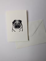 Hand-pulled block-printed card featuring a pug. Each card is unique, printed by hand, and comes with a matching envelope and a hand-printed back label.