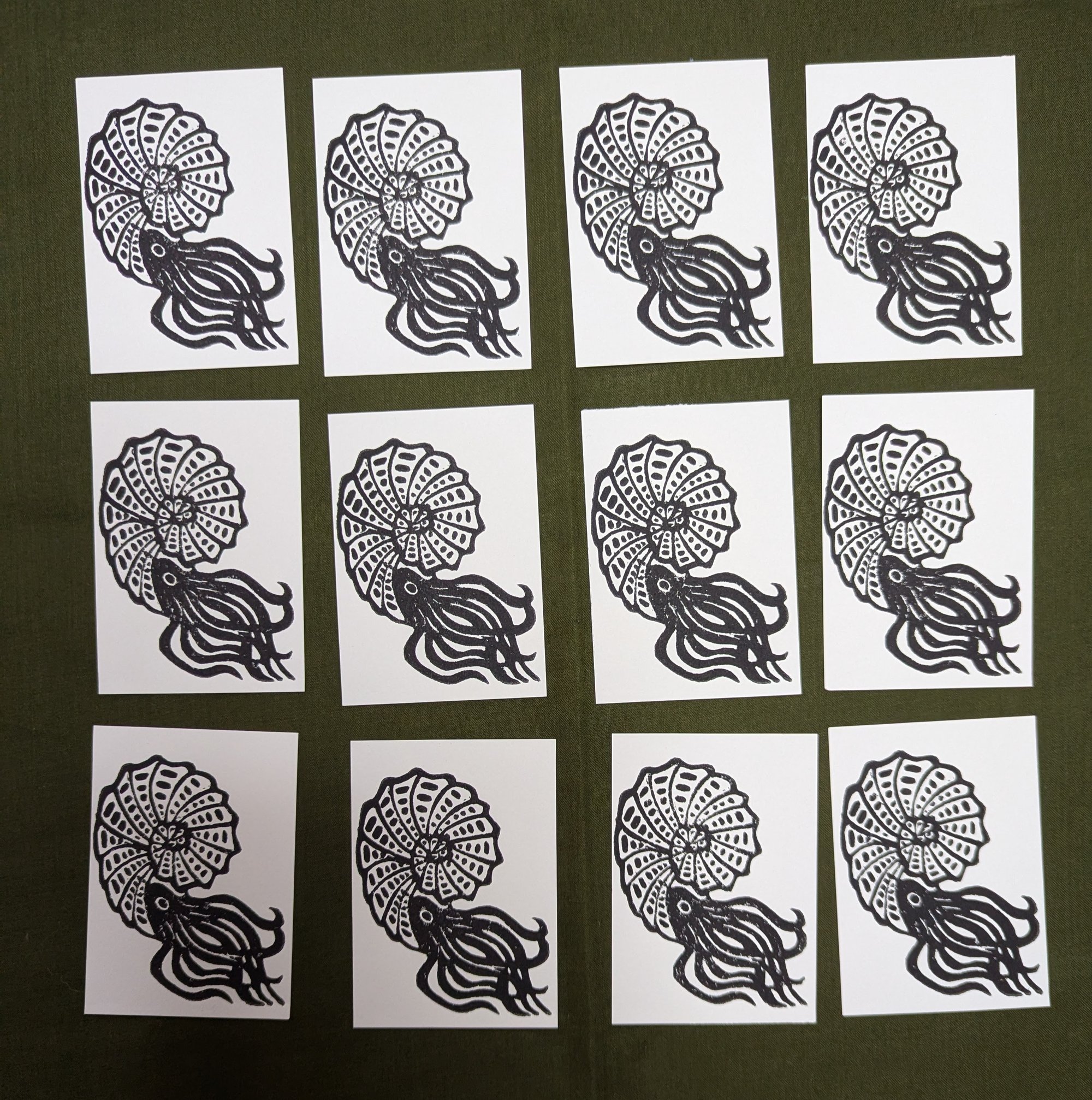 Hand-carved and printed using traditional linoleum relief techniques. An ancient sea wanderer, spiraled in mystery and memory. Each card is inked and ran by hand through a press, resulting in unique textures and slight variations that make every print one-of-a-kind.